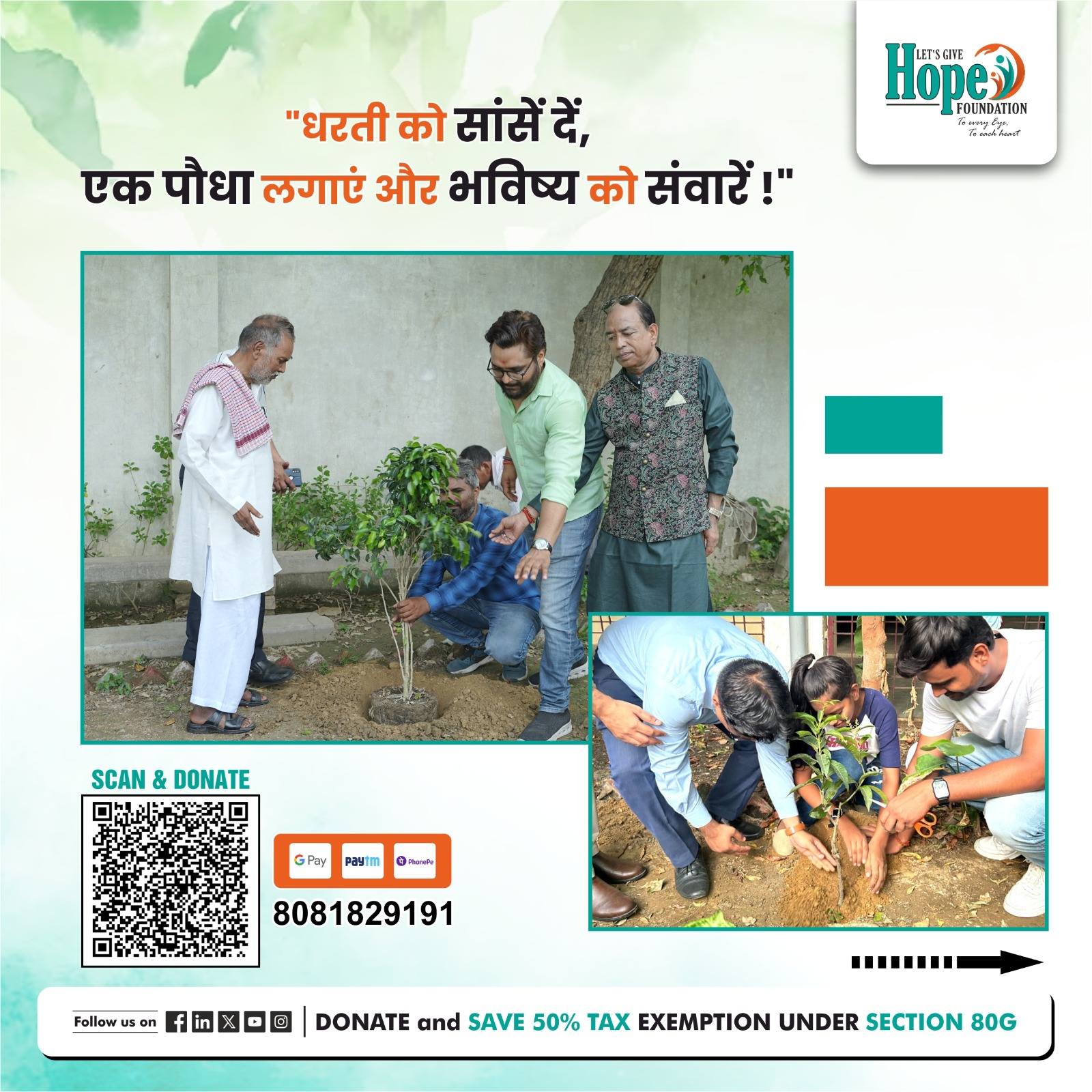 वृक्षारोपण अभियान 2025 एक पेड़ — एक जिम्मेदारी, एक कदम — हरियाली की सौगात! पेड़ हमें न सिर्फ छाया और फल देते हैं, बल्कि हमारे भविष्य को भी सुरक्षित रखते हैं। आइए, हरियाली के इस पुनीत कार्य में सहभागी बनें और अपने योगदान से धरती को हरा-भरा बनाएं। 01 पेड़ = 150 रुपये 10 पेड़ = 1500 रुपये (दान पर 50% टैक्स छूट — सेक्शन 80G के अंतर्गत) QR कोड स्कैन करें और दान करें। कॉल करें: 8081829191 हर एक पेड़ आपके आने वाले कल के लिए एक सुंदर तोहफा है। आज ही दान करके इस हरियाली महाअभियान का हिस्सा बनें!
