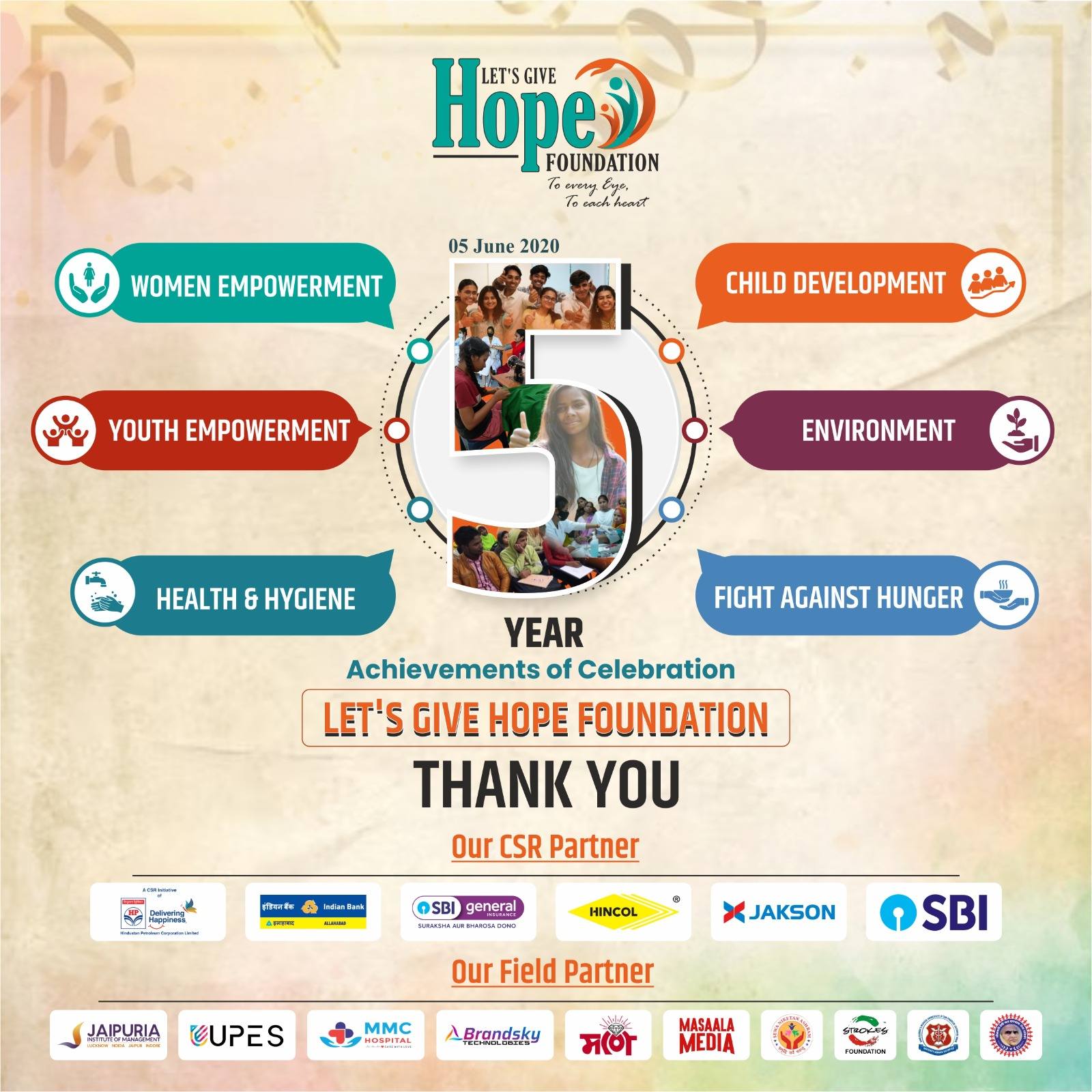 Celebrating 5 Years of Hope, Dreams, and Transformation! Today, we proudly mark the 5th anniversary of Let's Give Hope Foundation —a journey that started with a single step and grew into a movement of change. Over these incredible five years, we have: ❤️ Touched countless lives through education, skill development, and empowerment. ✋ Equipped every hand with skills to build a brighter future. Inspired every eye to dream big, to believe, and to rise. Planted faith in every heart—the belief that together, we can overcome any challenge. To our dedicated team, passionate volunteers, and unwavering supporters like SBI General Insurance , State Bank of India , Bank of Baroda , Indian Bank , Hindustan Petroleum Corporation Limited and many more supporters — thank you for making this journey unforgettable. Your love, time, and effort have been the backbone of our success. As we look ahead, we remain committed to giving hope, empowering lives, and transforming communities. Let’s continue to spread light, love, and opportunity—to every eye, every heart, every hand.