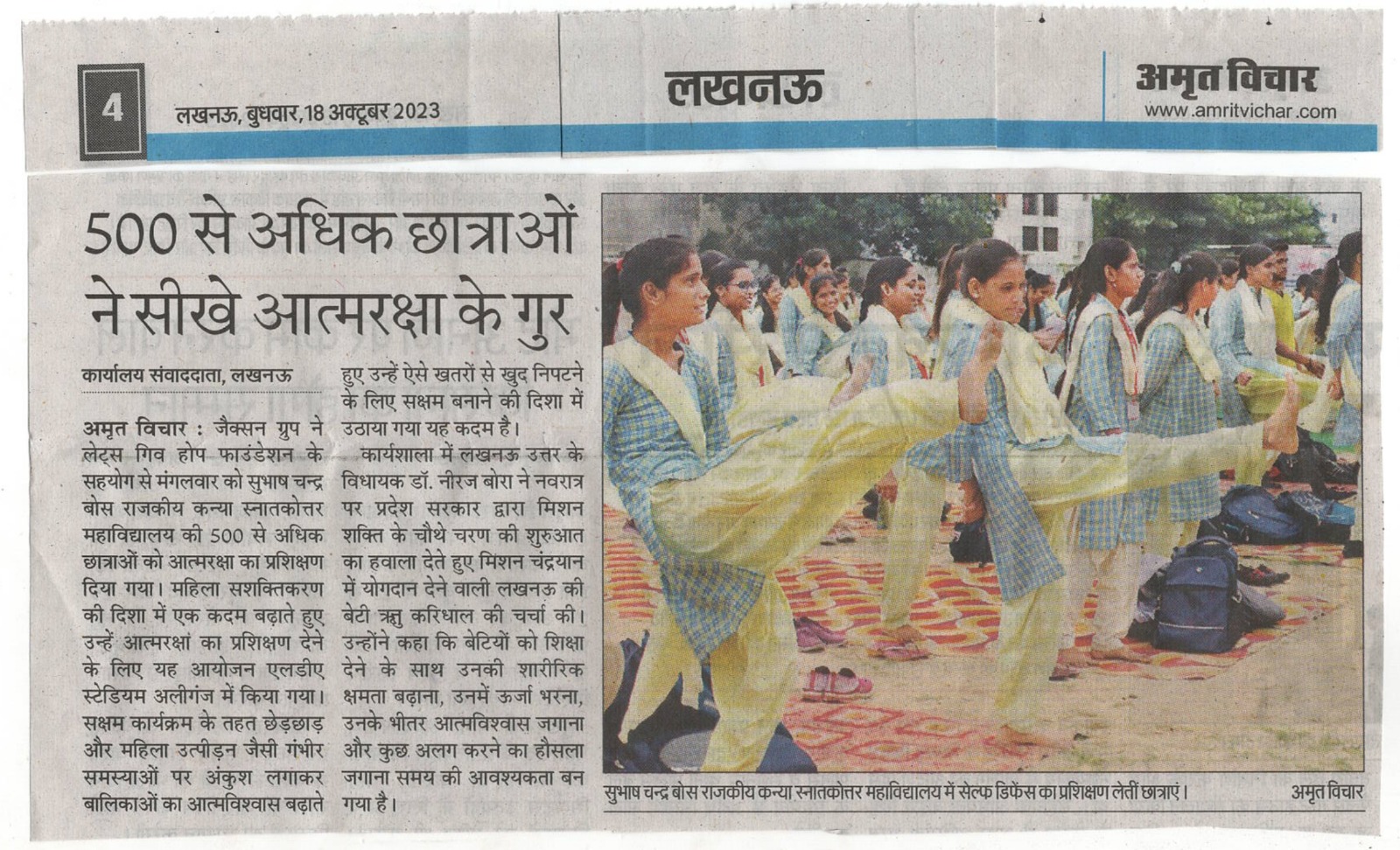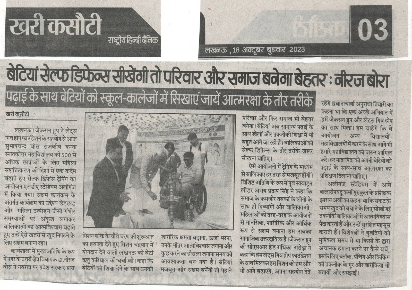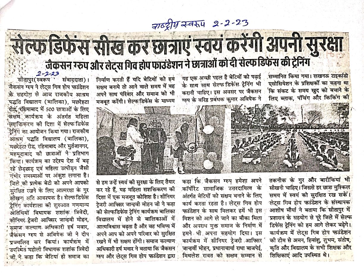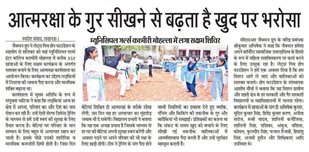 जैकसन ग्रुप ने लेट्स गिव होप फाउंडेशन के सहयोग से एक कदम बढ़ाते हुए सेल्फ डिफेंस ट्रेनिंग का आयोजन।